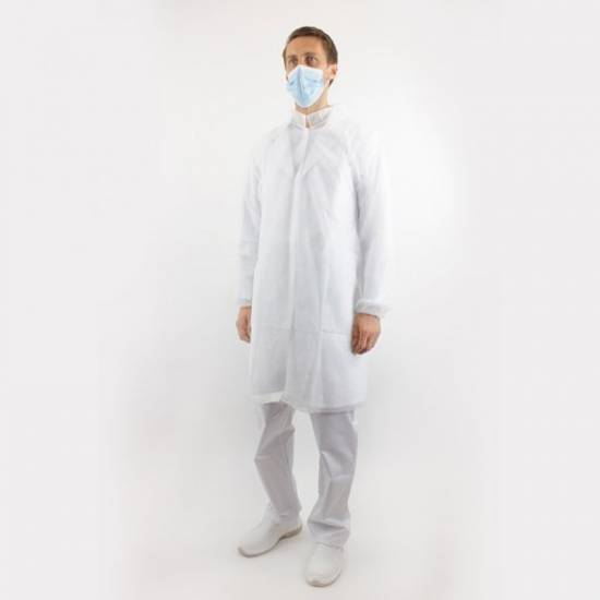 Jednokratni mantil EZRA beli. Sirovinski sastav: polipropilen. Karakteristike: mao kragna, bez džepova. Zatvaranje na čičak.